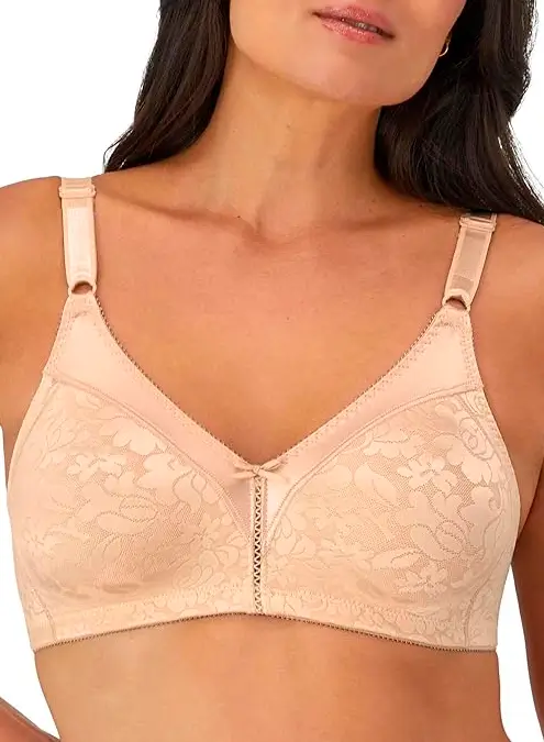 Experience the perfect combination of beauty and comfort with the Bali Double Support Wireless Lace Bra. This full-coverage design features innovative two-ply cups that deliver double the support without wires, while the signature M-frame construction ensures a flexible, personalized fit. The elegant satiny lace jacquard adds a touch of femininity while lying completely flat beneath your clothing. Enhanced with Cool Comfort moisture-wicking technology and stay-in-place Comfort-U straps, this bra offers all-day comfort with a built-up back for incredible smoothing.